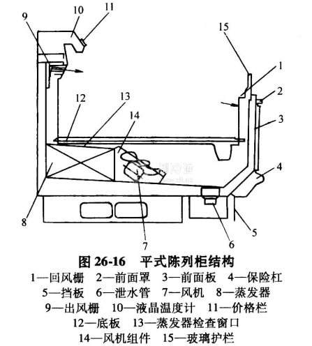 平式陳列柜又稱平型壁式陳列柜。它可以單面靠墻壁放置,或由營業(yè)員進(jìn)行面對(duì)面服務(wù)。平式陳列柜類同于單邊島式陳列柜,具有較寬的存貨底板.容積大,節(jié)省空間。具有雙溫的平式冷柜,一般為內(nèi)藏式制冷機(jī)組,以冷風(fēng)循環(huán)穩(wěn)定陳列食品的陳列貯藏溫度-2~3℃。當(dāng)陳列冷凍貨時(shí),可實(shí)現(xiàn)-18℃以下的低溫。平式陳列柜基本結(jié)構(gòu)如圖26-16所示。