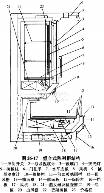 組合式陳列柜,一般由貨架式陳列柜和平式陳列柜組合而成。它具有上述兩種冷柜的性能和使用特點(diǎn),使超市商場(chǎng)地面與空間得到充分利用和多種類型的食品陳列展示,其典型結(jié)構(gòu)如圖26-17所示。