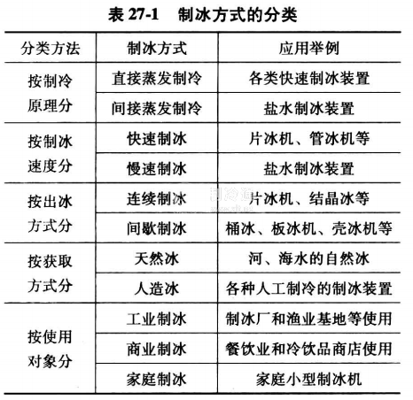 人造冰的制取包括制冰方式、制冰裝置和冰的形狀三方面內容。按制取方式分類見表27-1。