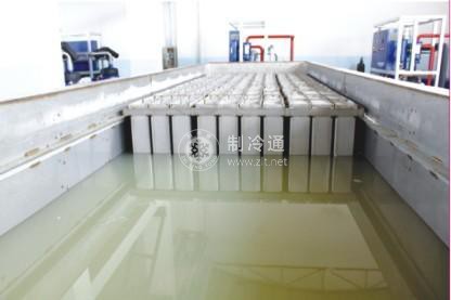 鹽水間接冷卻制冰,是用鹽水(常用氯化鈉或氯化鈣)作為載冷劑,把水的熱能轉移給制冷劑,使水結冰。