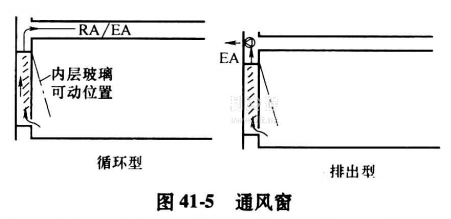 (1)通風窗通風窗有兩層間隔0.15一0. 2m的玻璃窗(外層玻璃采用高性能的反射玻璃,內層玻璃采用可開啟的6mm左右的強化透明玻璃),中間由遮陽百葉和空氣循環系統構成。通風窗可分為循環型和排出型兩種(見圖41-5)。循環型通風窗的窗內空氣熱量在供熱時可回入空調箱使用,在供冷時可排出室外。窗間風量為30~75m3/M·h。排出型通風窗在內外層窗之間設排風扇,排風直接排出窗外(例如上海久事大廈)。采用以上方式可較大地提高玻璃窗內表面溫度。以日本某大廈實測資料為例:冬季室溫22℃時,單層玻璃內表面溫度為9℃,如用上述通風窗后,玻璃內表面溫度上升到19℃。從而基本上消除了窗際冷輻射和冷感,大大提高了熱舒適程度,從而也可以不專門設置外區空調系統。