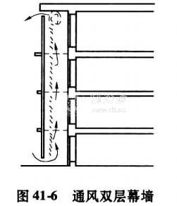 (2)通風雙層幕墻在建筑物外墻(幕墻、窗)增設一道玻璃幕墻,兩墻間距0. 6m以上,內設遮陽百葉。其主要作用是利用自然通風(熱壓作用為主),由室外空氣將遮陽的熱量帶走,因多一層外置幕墻而減小了進入室內的負荷。這種方式從20世紀90年代開始在西歐盛行,如圖41-6所示。