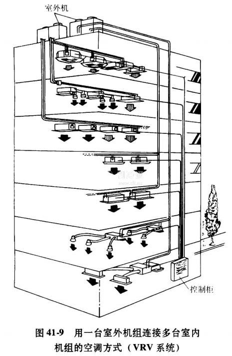 圖41一9所示為一辦公樓采用VRV空調系統的示意圖,各房間可以進行供冷或供暖的自動單獨控制。圖41一9所示是辦公大樓采用VRV系統的圖例。