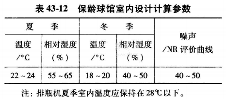 保齡球是一種健身娛樂活動,室內(nèi)溫濕度參數(shù)主要決定于人的舒適要求。室內(nèi)設(shè)計參數(shù)可參照表43-12選用。