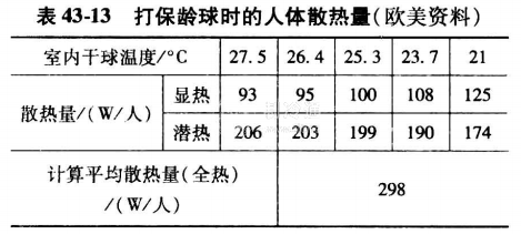 保齡球館的室內(nèi)冷負(fù)荷除來自圍護結(jié)構(gòu)外,主要是室內(nèi)發(fā)熱源。室內(nèi)發(fā)熱包括人體散熱、照明散熱和機器散熱等。在各種負(fù)荷中,通常是人體發(fā)熱量和新風(fēng)負(fù)荷占的比例較大。表43-13列出歐美資料中打保齡球時的人體散熱量。
