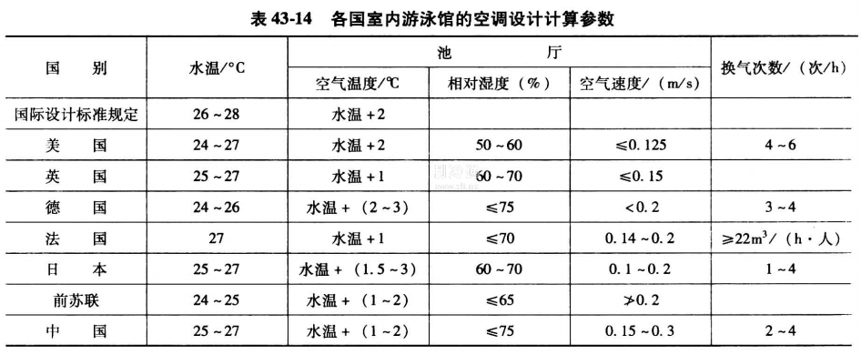 表43-14列出各國室內游泳館的空調設計計算參數。