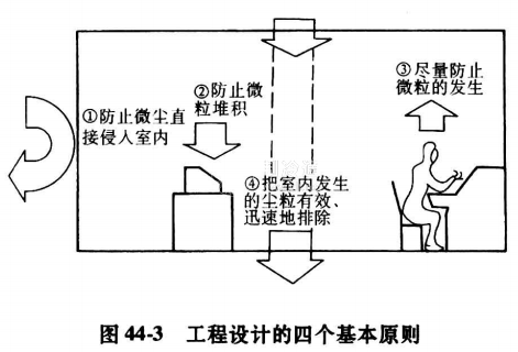 從潔凈室如何滿足工藝使用要求來看,當以實現“潔凈空間”為首要目標。為建立和維持該空間的潔凈水平,應該按如圖44一3所示的四個基本原則進行工程的設計、施工和運行管理。