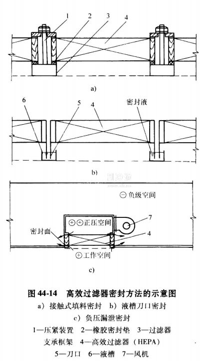 (3)負壓漏泄密封 這種密封方法的原理是正壓空間泄漏的污染空氣,人為疏導到工作區外的負壓空間,確保工作區不受污染。這種密封方法通常用于小規格的潔凈室的密封。高效過濾器密封方法的示意圖見圖44-14。