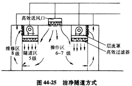 從氣流剖面來看,是一種放射狀的氣流,它可以較小風量達到較高的潔凈度(如K=200次/h,可實現5級潔凈度),以節約運行費用。此外,有些生產工藝僅要求在潔凈室的局部工作區內達到高潔凈度,故使潔凈氣流先經該操作部位。非操作部位可降低級別,以節省費用,因而構成了如圖44-25所示的潔凈隧道方式的氣流。