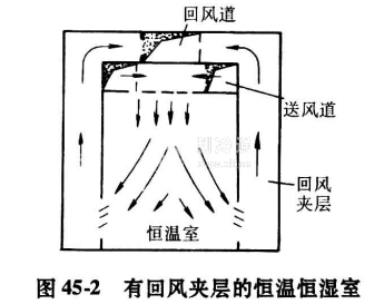 2)在高精度恒溫恒濕室的外圍,最好有低精度的恒溫室作為其外室或套間。這樣,就能使高精度恒溫恒濕室不受外界氣候變化的影響,減少室內溫濕度波動范圍,因而使控制系統的工作比較穩定,易于保證精度要求。此外也可做成如圖45一2所示的回風火層,利用恒溫恒濕室本身回風包圍恒溫恒濕室,以減少外界不穩定熱源的影響。