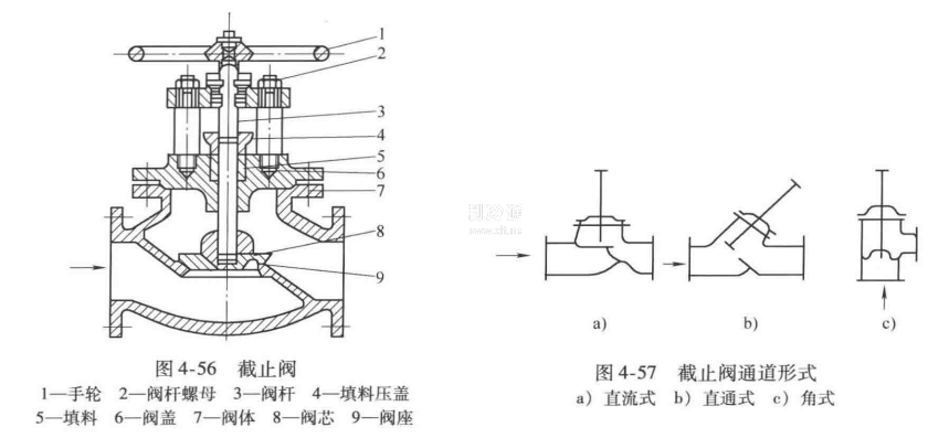 截止閥由閥芯、閥座、閥體、閥桿、填料、填料蓋、手輪等構件組成,如圖4-56所示。截止閥按介質流動方向的不同可分為直通式、直流式和角式三種,如圖4-57所示。若按閥桿螺紋的位置則可分為明桿及暗桿兩種。小直徑的截止閥一般為暗螺紋桿式;直徑較大,工作溫度較高且用于腐蝕介質的截止閥一般為明螺紋桿式。按密封面形式分為平行密封面和錐形密封面兩種。平行密封面啟閉時擦傷少,容易研磨,但啟閉力大,多用于大口徑閥門;錐形密封面結構緊湊,啟閉力小,但啟閉時容易擦傷,研磨需專用工具,多用于小口徑閥門。