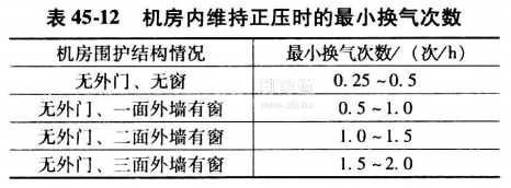 2)保證機房正壓要求。為了防止外界環境空氣滲入機房,干擾室內溫濕度或破壞室內空氣潔凈度,需要用一定量的新風來保持室內正壓。通常室內正壓應保持在5一10Pa。不同窗縫情況下,內外壓差為AH時,經過窗縫的滲透空氣量,也可根據圍護結構情況,用每小時的換氣次數來確定,見表45-12。