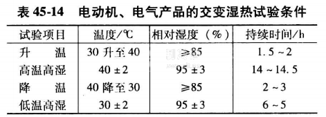 試驗技術條件 高溫高濕室也稱潮熱試驗室,用以對產品性能進行試驗。如:對于電氣產品、儀器儀表等,以檢驗其電氣絕緣性能、銹蝕老化等現象。典型的對于電動機、電氣產品的交變濕熱試驗條件列于表45-14。