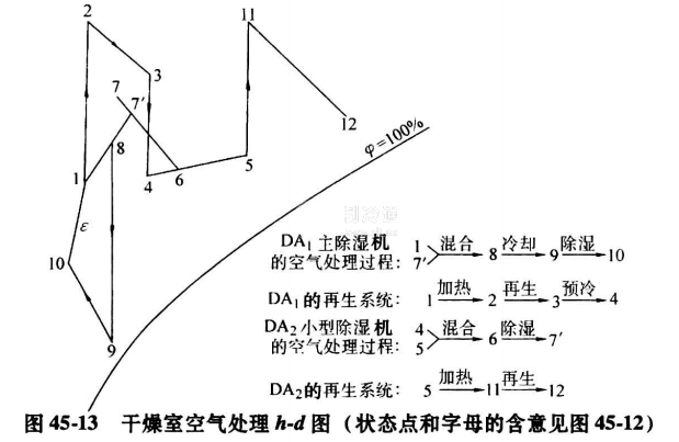 圖45-12為該干燥室空氣處理流程圖。圖45-13是干燥室空氣處理h-d圖上的表示,圖45-12的表中則列出了干燥室主要設備。