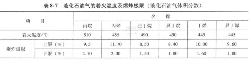 由于液化石油氣化的著火溫度低,引燃能量和爆炸下限低,爆炸范圍大,遇火源就有燃燒、爆炸的危險。因此,液化石油氣是一種易燃易爆的介質。表8-7列出了液化石油氣的著火溫度、爆炸極限。