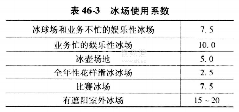 美國、加拿大、日本等國給出了計算冰場單位面積負荷的線算圖。可根據使用系數和平均濕球溫度而定。使用系數可按表46-3選定。