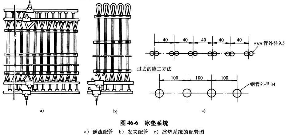 對(duì)于臨時(shí)性的冰場(chǎng)(如對(duì)冬季閑置的游泳池,臨時(shí)改成溜冰場(chǎng))可采用裝配式的冰墊方式。對(duì)于國(guó)際標(biāo)準(zhǔn)尺寸的冰場(chǎng)(60m x 30m)尤為適用。國(guó)際上廣泛采用美國(guó)ITT公司生產(chǎn)的冰墊系統(tǒng),如圖46-6所示。