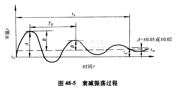 控制系統受階躍干擾后,從一個穩定狀態變化到另一個穩定狀態,期間被控參數隨時間而變化。研究過渡過程的目的是為了研究控制過程的質量。過渡過程可以是發散振蕩的、等幅振蕩的,也可以是單調衰減的。最為典型的則是如圖48-5所示的衰減振蕩過程。發散振蕩與等幅振蕩過程,均屬于不穩定的控制過程。在連續控制過程中它們均是不允許的,但在雙位控制過程中,只要波幅與波動頻率在工藝允許范圍內,卻是可以采用的。