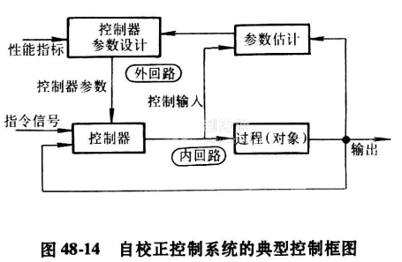 (1)自校正控制系統(tǒng) 也稱為參數自適應系統(tǒng)。此系統(tǒng)必須對對象(過程)進行辨識,然后將系統(tǒng)期望的或最優(yōu)的性能進行比較,使系統(tǒng)趨向最優(yōu)的性能的決策。最后,再對控制器進行適當的修正,以使系統(tǒng)接近最優(yōu)狀態(tài)。這些是自校正自適應系統(tǒng)具備的基本功能,其典型控制框圖見圖48-14。此系統(tǒng)的缺點是:參數的估計要從零開始,使之在系統(tǒng)過渡過程階段不能應用。