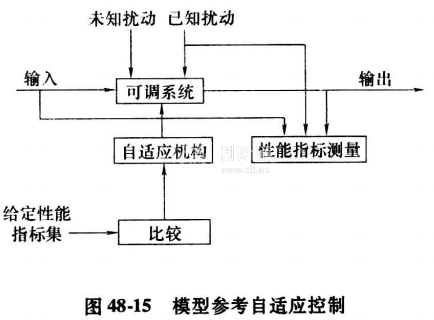 模型參考自適應系統(tǒng)就是利用它的一個可調系統(tǒng)(包括對象及控制器)的輸入狀態(tài)和輸出變量.來度傲某個性能指標,然后根據實測性能指標值,與給定性能指標值相比較的結果,由自適應機構修正可調系統(tǒng)的參數,產生一個輔助輸入信號,以保持控制系統(tǒng)的性能接近給定的性能指標值。模型自適應控制的定義說明見圖48-15。
