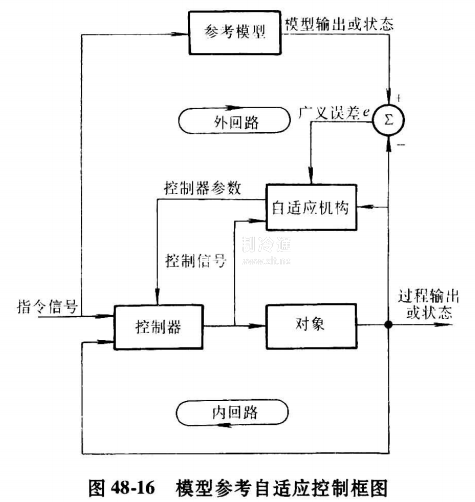 同自校正控制系統(tǒng)一樣,模型參考自適應控制系統(tǒng)也劃分為兩個反饋回路:內回路是由對象和控制器組成的常規(guī)反饋回路;外回路是調整控制參數的自適應回路。調整方法都是基于對象的輸人與輸出信號的測縫。在這個回路中,引入了一個稱為參考模的輔助系統(tǒng)。這個輔助系統(tǒng)與可調系統(tǒng)的指令輸人相聯,也與這個參考模型的輸入相聯,所以模型的輸出和狀態(tài),就可用來規(guī)定希望的性能指標。其基本控制框圖如圖48-16所示。