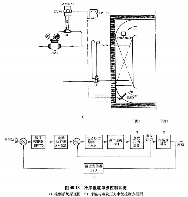 串級控制系統由主控制回路和副控制回路串接組成。主控制器的輸出信號,作為副控制器的給定值,因此主控制器所形成的系統是定值控制系統;而副控制器的工作是隨動控制系統。利用副控制回路的快速控制作用,以及主副回路的串級作用,可以大大改善控制系統的性能。圖48-18為冷庫溫度串級控制系統的系統框圖與應用實例。它用于香焦船的冷藏艙庫溫控制,主控制器為EPT70比例積分電動溫度控制器,剛控制器為電動壓力導閥CVM。主控制回路由庫溫電阻發信器tR、主控制器EPT70比例積分電動溫度控制器電動執行器AMD23組成;副控制回路由電動壓力導閥CVM、調節主閥PM組成。