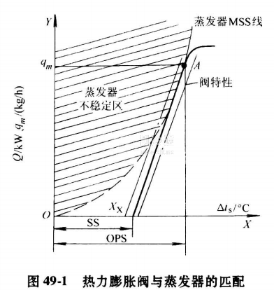 “匹配”就是要求熱力膨脹閥和蒸發器一起工作時,能夠穩定運行,并最大限度地利用蒸發器有效面積,形成最佳匹配。目前國際上流行的匹配方法,是基于蒸發器最小穩定信號法(MSS)進行的。如圖49-1所示,每臺蒸發器均有一條最小穩定信號線,當蒸發器工作在MSS線左側,則系統將不穩定,若工作在MSS線右側,則系統工作穩定,似蒸發器利用率卻因過熱度太大而不高。在MSS線上為零過熱,處于臨界狀態。圖中A點是最佳匹配點,此時蒸發器處于零過熱,發出制冷量也最大,熱力膨脹閥處于最佳工作點,而膨脹閥的靜態過熱度為SS。