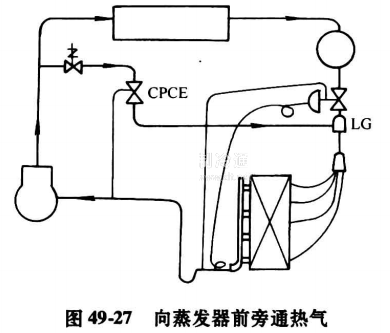 熱氣向吸氣管旁通附加噴液冷卻存在一個缺陷,即負荷低到一定程度,蒸發(fā)器內(nèi)制冷劑流速過低,造成回油困難。為此采用本方法,向蒸發(fā)器中部或前旁通熱氣。采用本方法,相當于熱氣為蒸發(fā)器提供了一個“虛負荷”,盡管實際負荷較低,熱力膨脹閥仍能控制向蒸發(fā)器供液量較多,保證蒸發(fā)器中有足夠的制冷劑流速,不會帶來回油困難。
