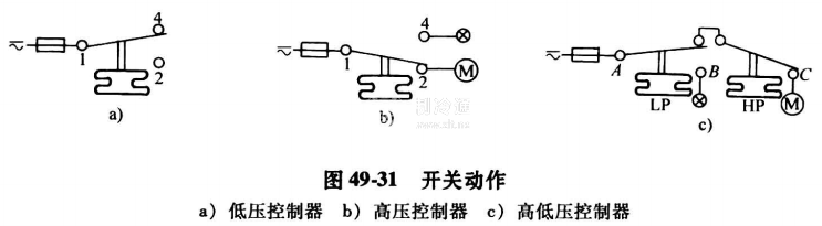 圖49-29所示是壓力控制器的典型結構圖。圖49-30是高低壓力控制器的結構圖。圖49-31是它們的開關動作圖。圖49-32是它們在制冷系統中的安裝圖。