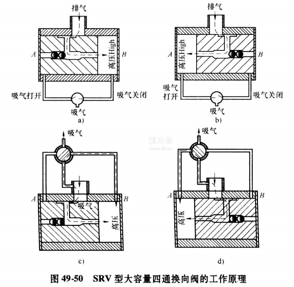 其工作原理見圖49-50,它是一套可拆式電磁導閥,帶壓力操作主閥系統,斷電狀態時(見圖49-50a) ,高壓氣體通過先導閥的流道入B端;當電磁通電時,(見圖49-50b),主閥體的B端將通過先界閥與吸入端接通,使高壓氣體排出,壓差使先導閥心移向B端,高壓氣體將閥心移向 B端。在常態(見圖49-50c)高壓排氣通過先導閥和主閥流向B端。