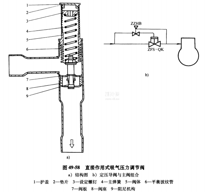 吸氣壓力調節閥亦稱曲軸箱壓力調節閥,用來控制壓縮機吸氣壓力,防止吸氣壓力過高而引起電動機過載。它一般安裝在壓縮機吸氣管上(見圖49-58b),是一種受閥后壓力控制的直接作用式比例調節器,其典型結構如圖49-58a所示。這是丹麥Danfoos,公司的KVL型吸氣壓力調節閥,其主要技術參數見表49-35,其比例帶為0. 13。