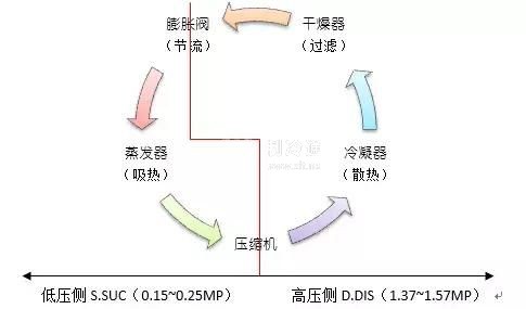 制冷機中使用的工作介質稱為制冷劑,制冷劑在制冷機中循環流動,同時與外界發生能量交換,不斷地從被冷卻對象中吸取熱量,向環境排放熱量。制冷劑一系列狀態變化過程的綜合為制冷循環。為了實現制冷循環,必須消耗能量。所消耗能量可以是機械能、電能、熱能、太陽能或其它形式的能。