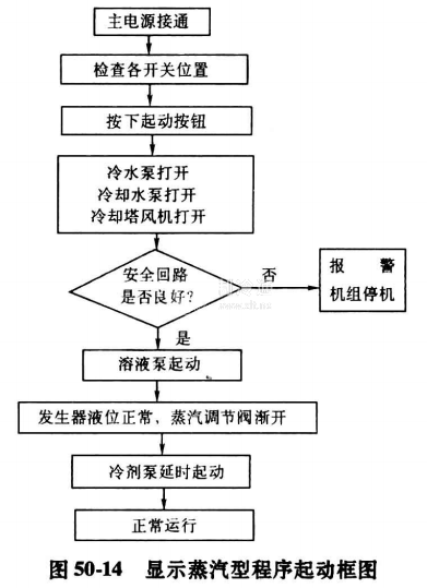 溴化鋰機組要實現正常的起動與停機,必須具有一系列的程序運行系統,主要包括程序起動系統、程序停機系統。程序停機系統又包括程序正常停機系統和程序故障停機系統。這些系統保證了溴化鋰機組能夠安全可靠、穩定經濟地運行。