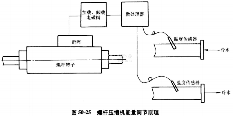 壓縮機的滑閥所處的位置,根據冷水或鹽水出口溫度的大小進行控制。溫度傳感器,微處理器,加載、減載電磁閥,滑閥共同組成了對冷水溫度(或鹽水溫度)進行控制的閉環系統。能量調節原理見圖50-25。另外,機組還可根據冷水進水溫度來調節滑閥。采用冷水的進口溫度和冷水的出口溫度發信,均可以控制冷水的溫度。這兩種控制方式的區別,主要在于冷水的進口溫度調節受外界負荷影響較大,機組控制反映迅速,但控制波動較大;采用冷水的出口溫度控制,機組控制反映較慢,但控制波動較小。通常,該控制器的控制規律采用比例調節規律。比例帶可根據實際情況選定和修改。