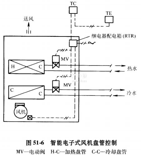 圖51-6所示是溫控器加三速開關的四管制變流量風機盤管系統。該系統中,冷熱水管道分開,并分別使用冷水電動調節閥和熱水電動調節閥進行控制。室內溫度控制器可實現PI控制,并可根據室內溫度自動進行風機風量的控制。同時風機風量還受來自于室內的手動信號控制。溫度控制器具有液晶顯示室溫的功能,溫度設定以數字式表示。
