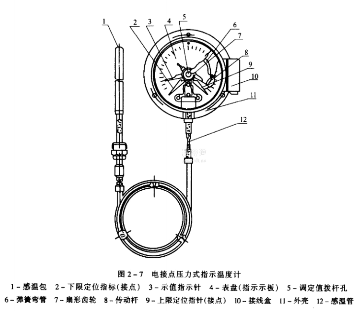如果在儀表中心增加二個可調節的上限和下限定位指針,即可以做成電接點壓力式指示溫度計。這三個指針相互絕緣,引出三根導線。當溫度升高到所調上限時,指針與上限定位指針接觸,發溫度上限信號;當溫度降到下限時,指針與下限定位指針接觸,發溫度下限信號。如圖2-7。