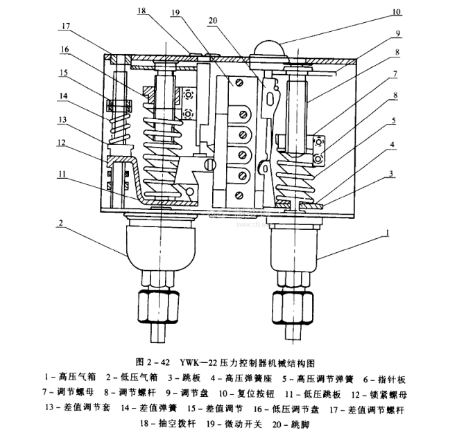 核心提示:YWK-22型壓力控制器是將高壓過高保護(hù)和低壓過低保護(hù)兩部分合并裝在一個(gè)殼體內(nèi),適用于制冷壓縮機(jī)的排氣壓力過高和吸氣壓力過低保護(hù),也叫高低壓控制器。其結(jié)構(gòu)見圖2-42所示。