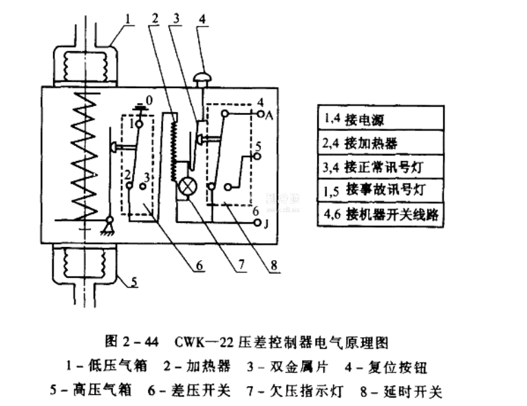 CWK-22型壓差控制器主要用于制冷壓縮機的油壓差保護,故又稱油壓差控制器。其結構見圖2-43,電氣原理見圖2-44。