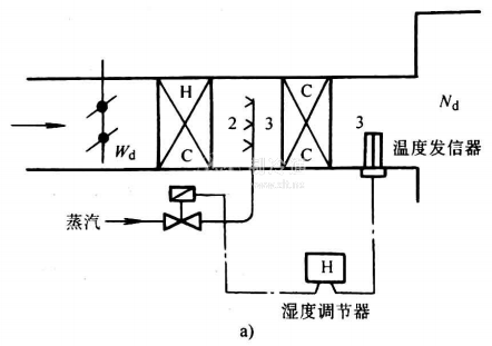 ③降溫降濕系統的濕度調節,見圖51-22a濕度發信器裝在送風管或室內,濕度調節器控制空氣冷卻器的進液電磁閥,來調節室內濕度。