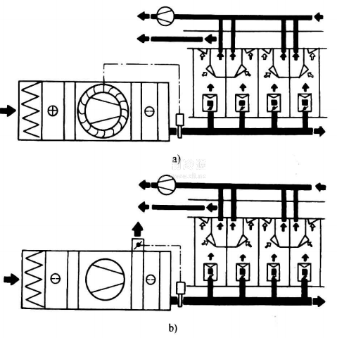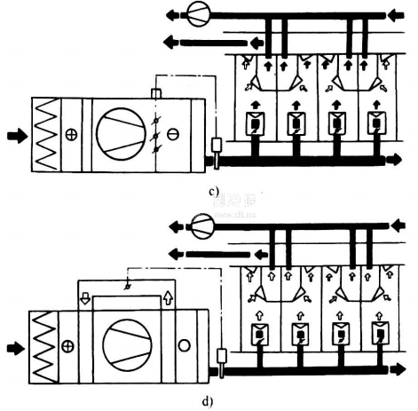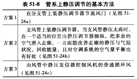 靜壓調節按靜壓調節器的安裝位置,分為中央空調器上的靜壓調節和管系中的靜壓調節。中央空調器上靜壓調節的基本方法大致可分為5種,找方案原理圖見圖51-23。管系上靜壓調節主要有三種方案,見表51-8,其方案的原理圖見圖51-24。