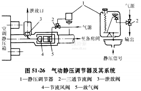 (2)間接作用式靜壓調(diào)節(jié)器 氣動(dòng)靜壓調(diào)節(jié)器及其系統(tǒng)如圖51-26所示。在空調(diào)器靜壓箱出口的每一支管上,裝有氣動(dòng)伺服活塞,它帶動(dòng)一個(gè)節(jié)流風(fēng)閥4與一個(gè)放氣閥5,當(dāng)該支管靜壓升高時(shí),通過(guò)簡(jiǎn)易氣動(dòng)靜壓調(diào)節(jié)器1,控制氣動(dòng)伺服活塞,把節(jié)流風(fēng)閥4關(guān)小,閥4通過(guò)軟軸與閥5連接,把放氣閥5打開,泄放部分空氣至走廊,維持該支管中靜壓穩(wěn)定。