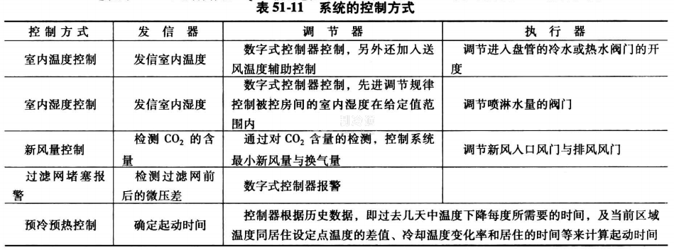 進行CO2的含量控制,是要保證空調房間的空氣質量,同時又要考慮系統的節能因素。因此CO2含量檢測器放置在空調系統的回風管內,以檢測空氣的質量。通過這個參數的檢測及與給定指標的比較,控制新風風門與回風風門的開度,保證系統的最小新風量,送風溫度輔助控制是在大空間里,為了防止由于室內溫度和送風溫度傳熱延遲而引起的溫度的變動,根據送風溫度來預測室內溫度的變化,以此預測值來輔助控制閥門的開度,系統的控制方式見表51-11 。