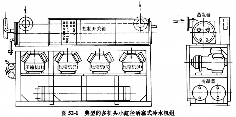 圖52-1所示即為典型的多機頭小缸徑水冷活塞式冷水機組。屬于這一類型的有上海合眾開利公司的30HK和30HR系列;上海冷氣機廠的LSB系列產品等。