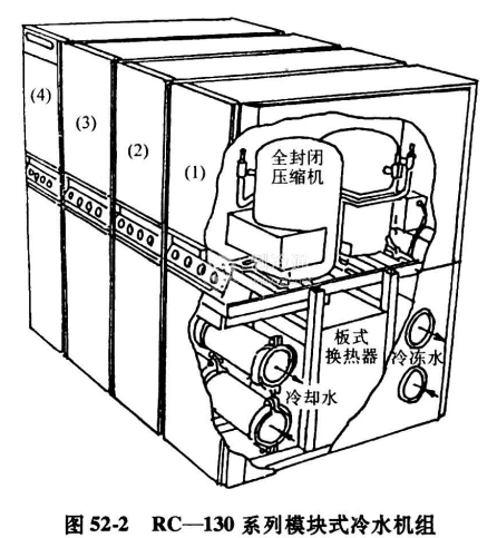 采用全封閉型活塞式壓縮機(jī)和板式換熱器的單元模塊式冷水機(jī)組。圖52一2所示為廣東番禺捷豐冷凍器材公司生產(chǎn)的RC-130系列模塊式冷水機(jī)組。該類機(jī)組在結(jié)構(gòu)上有若干特點(diǎn)。首先,其主機(jī)采用的是全封閉活塞式壓縮機(jī),蒸發(fā)器和冷凝器采用板式換熱器。其次,在整機(jī)結(jié)構(gòu)型式上采用標(biāo)準(zhǔn)單元模塊組合的方式。每一標(biāo)準(zhǔn)單元由兩臺(tái)壓縮機(jī)各帶單獨(dú)的一套制冷循環(huán)環(huán)路構(gòu)成。組合的機(jī)組容量可在65 -1700kW范圍內(nèi),根據(jù)需要,利用類似積木的方法進(jìn)行增減組合。由于該類機(jī)組在結(jié)構(gòu)型式上采取了一些新的手法,所以,作為制冷機(jī),它具有下列特點(diǎn):
