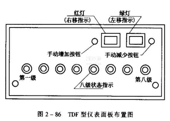 圖2-86是TDF型分級步進能量調節器的面板布置圖。按一下增能或減能按鈕,既可人為地增加或減少一級能量。面板右上方的紅燈和綠燈指示出能量的增減狀態,八級狀態指示燈指示出輸出級數,燈亮的數目就是儀表輸出的級數。