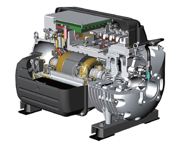 它與一般離心式壓縮機另一最大不同之處,在于其所用軸承結構和由此帶來的技術性能上的巨大差異。前者采用的是磁懸浮式軸承。磁懸浮式軸承的特點在于,當它正常運行時可使轉軸騰空懸浮起來,脫離軸承的支承,與軸承之間始終保持某一微小的間隙,從而不會產生兩者之間的接觸和摩擦。