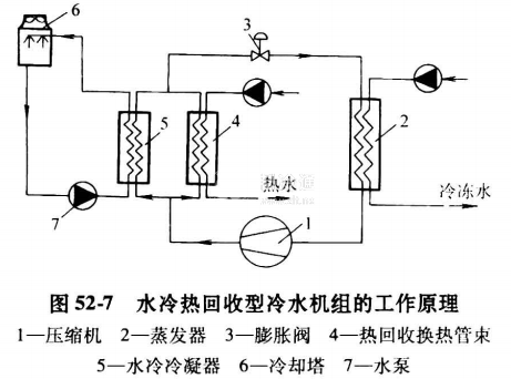 水冷熱回收型冷水機組是在標準型水冷式冷水機組的基礎上派生出的,可對冷凝廢熱加以部分回收或全部回收利用的水冷雙管束型冷水機組或水冷熱回收型冷水機組。其工作原理如圖52一7所示,是將水冷冷凝器作成兩組管束:一組用于冷凝熱的回收;另一組用于將利用不了的多余熱量排除出去。兩組管束熱量的分配可在一定的限度(取決于熱回收管束的換熱面積)范圍內,隨時根據用熱設備需用熱量的多少來進行控制。此外,在結構上隨制造廠家的不同,用于熱回收的換熱管束既可做成如圖52一7所示的,從制冷循環角度看,與水冷冷凝器并聯,也可串接在其前。