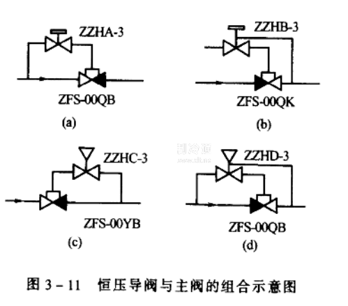 組裝方式見圖3-11 (d)所示。當主閥出口壓力升高時,ZZHD-3成比例關小,主閥也成比例關小;當主閥出口壓力升高時,ZZHD-3成比例開大,主閥也隨之成比例開大。所以,這種組合方式可控制主閥出口壓力在一定范圍內恒定??捎糜跓岚比谒銐嚎刂坪头乐箟嚎s機吸氣過載控制等。