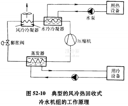 1)風(fēng)冷熱回收式冷水機組這是在常規(guī)的風(fēng)冷制冷循環(huán)環(huán)路中風(fēng)冷冷凝器之前,再小接一組水冷冷凝管束而構(gòu)成。其工作原理示于圖52-10。利用這類機組的運行,可把制冷循環(huán)中的冷凝熱部分或全部加以利用,從而以一定溫度的熱水劃式提供使用。