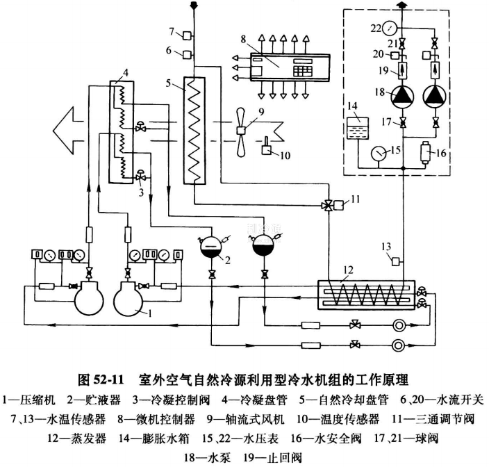 2)室外空氣自然冷源利用型冷水機組如圖52-11所示,這是在常規(guī)的風(fēng)冷冷水機組中風(fēng)冷冷凝器的風(fēng)路前,加裝一組輔助盤管,構(gòu)成一種節(jié)能型風(fēng)冷冷水機組。該類機組主要用于全年需要供冷的場合,例如:計算機房、潔凈室等。在夏季,機組如同普通風(fēng)冷式冷水機組一樣運行。在存、秋季,可利用相對低溫的室外冷空氣,對系統(tǒng)中的冷水回水進行預(yù)冷,以降低蒸發(fā)器的負荷。及至冬季,利用輔助盤管和室外低溫冷空氣的冷卻效應(yīng),可以在少開或完全不開制冷機的情況下,為用戶提供充足的冷源。顯然,這種十分巧妙的構(gòu)思和結(jié)構(gòu)的設(shè)計,為這類機組的節(jié)能運行提供了巨大的潛力。